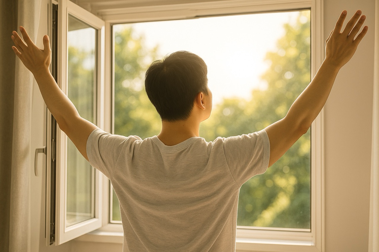 커튼을 열고 햇빛을 맞으며 깊은 호흡을 하면 생체 시계가 빠르게 리셋됩니다. 코로 깊게 들이마시며 양팔을 천천히 위로 들어 올리고, 입으로 내쉬면서 팔을 내려보세요. 5분만 반복해도 체온이 상승하며 졸음이 줄어들고 에너지가 올라옵니다.